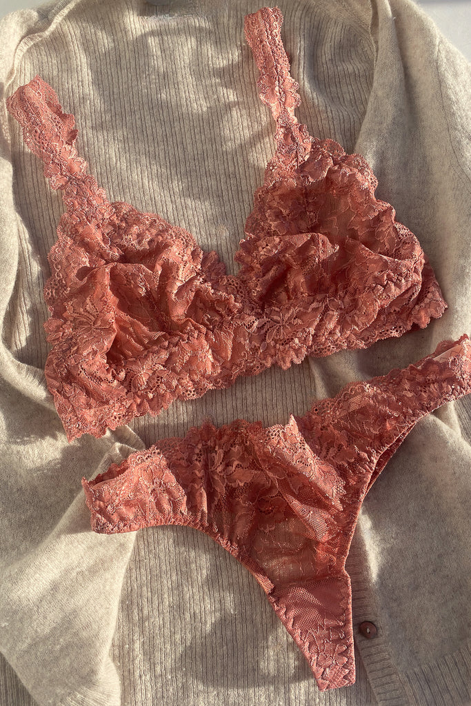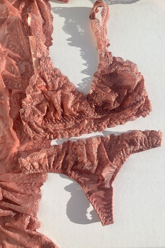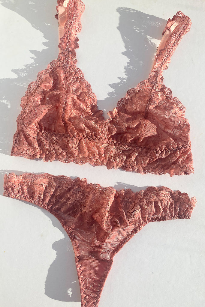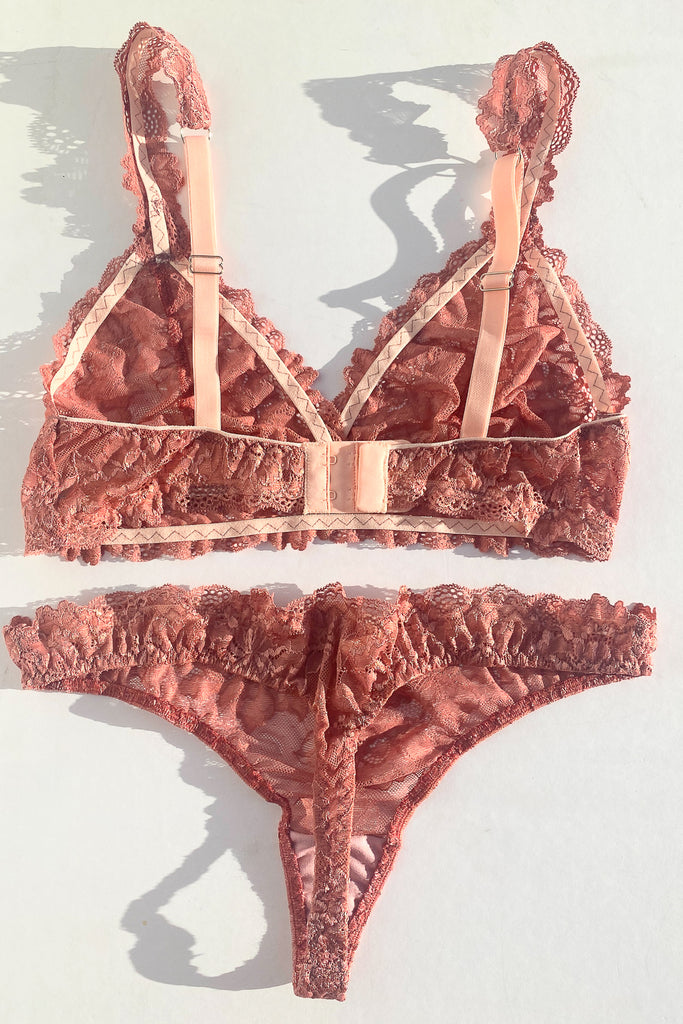 Discover the delicate charm of our Antique Rose pink terracotta lace bralette and thong set. Crafted from soft floral lace, it features pale pink straps and a hook-and-eye closure for a subtle, playful touch. Experience the comfort and beauty of this lace set as it gently embraces your skin.