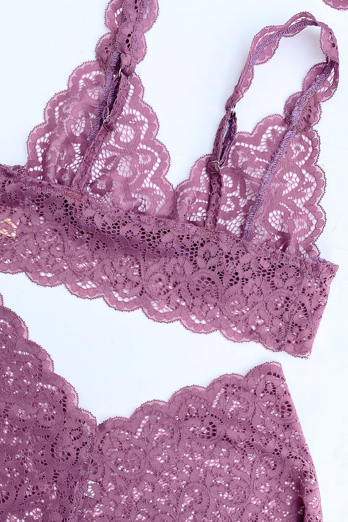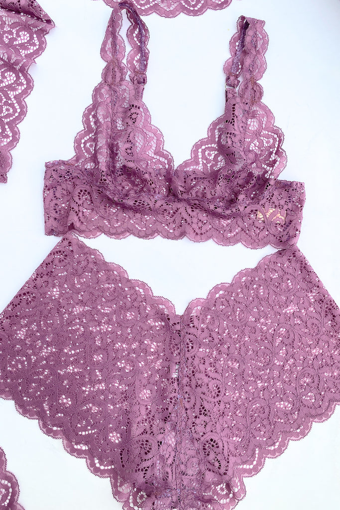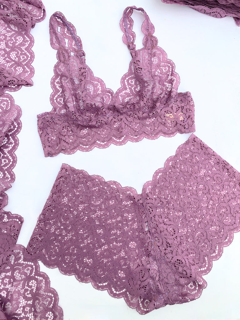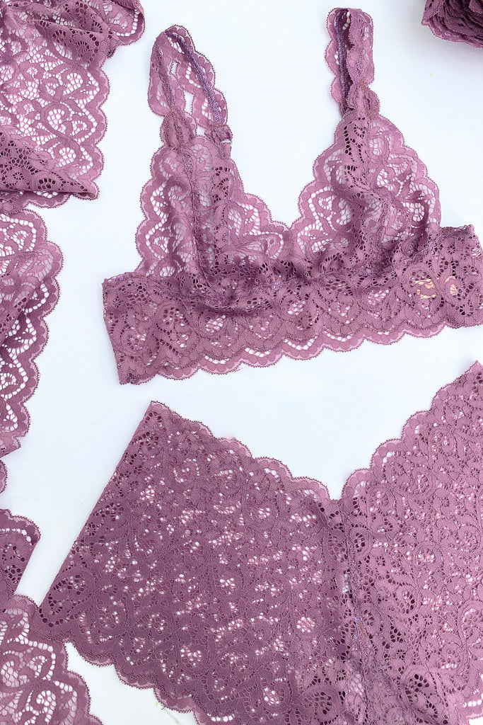 Welcome to our lace Tiger Lily set in Grape. This vintage-inspired set is handmade in the UK from the beautiful soft lace reclaimed from the UK fashion industry.