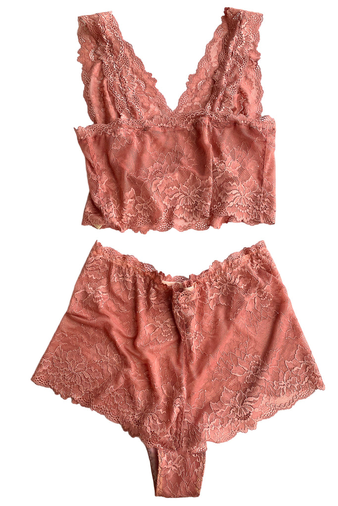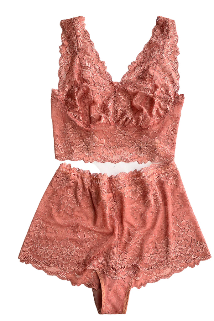 Antique Rose Lace Plunge Bralette and High Waist Panty Set