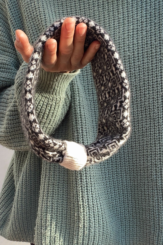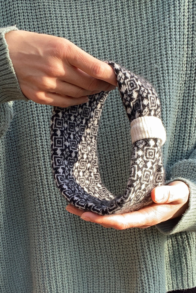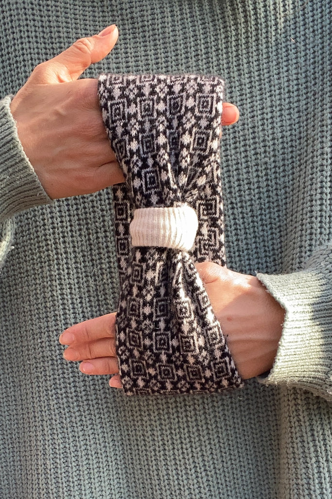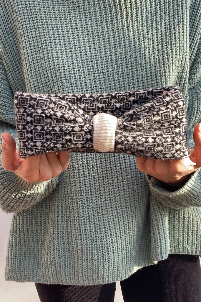 Welcome to our soft upcycled cashmere headband in playful ‘bow’ style. Handmade from gorgeously soft Black and White Geometric cashmere with white ribbed band at the centre.