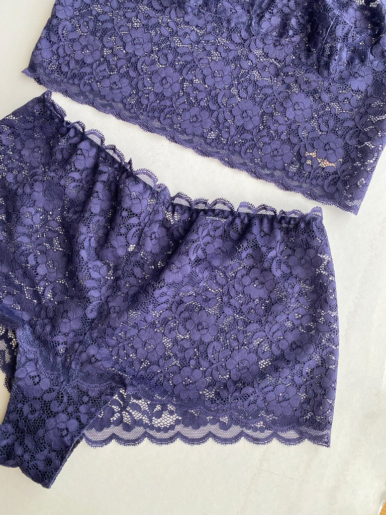 Discover the elegance of our plunge bralette and high waisted knicker set, crafted from sumptuous deep Navy blue floral lace. This stunning combination celebrates your natural beauty with its flattering silhouette and delicate detailing, designed to make you feel confident and supported all day long.